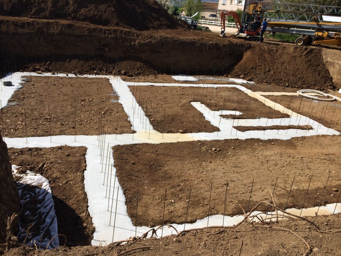 Réalisation des fouilles de fondations et des murs porteurs bétons pour une maison individuelle.